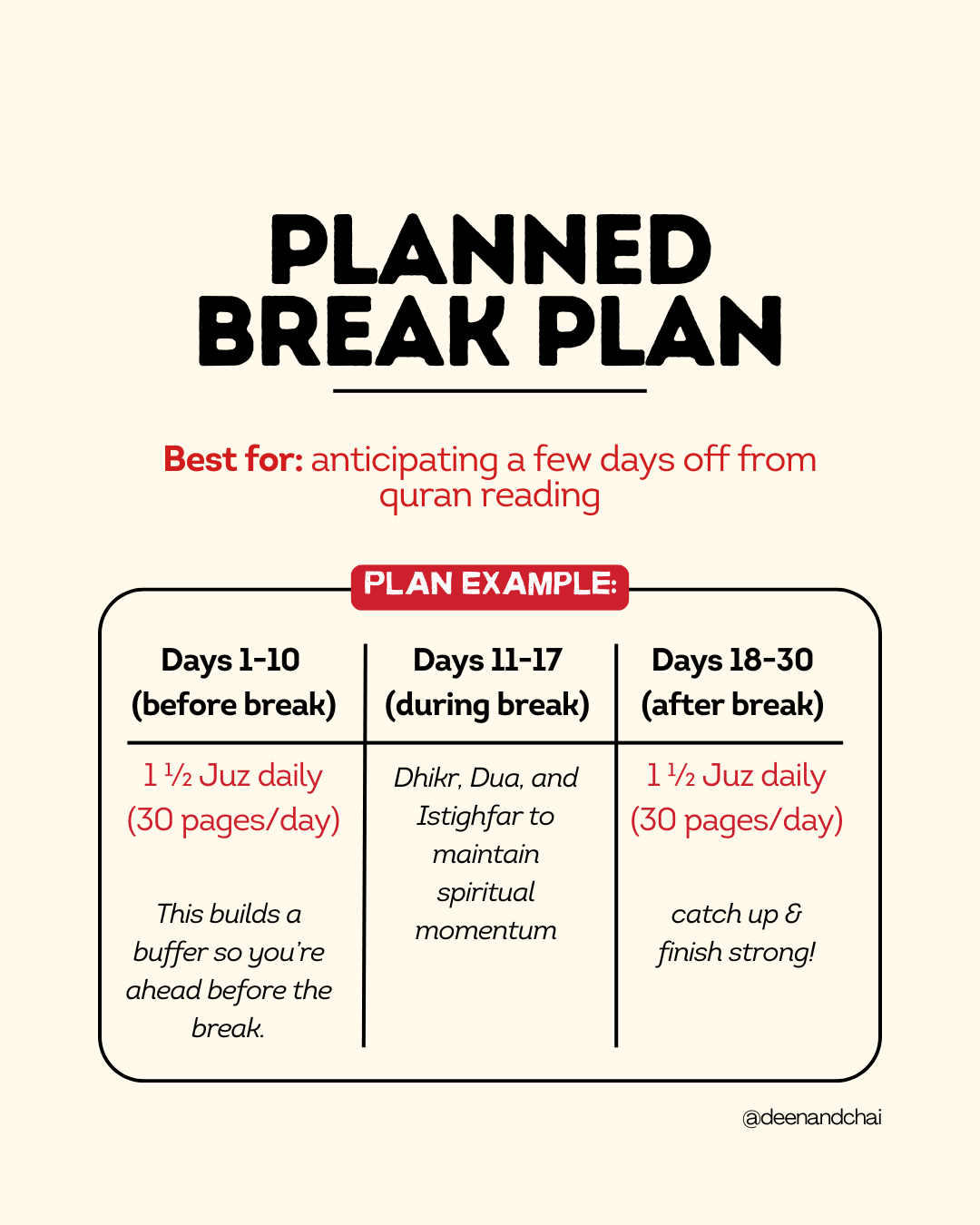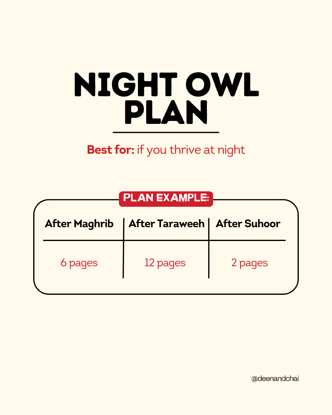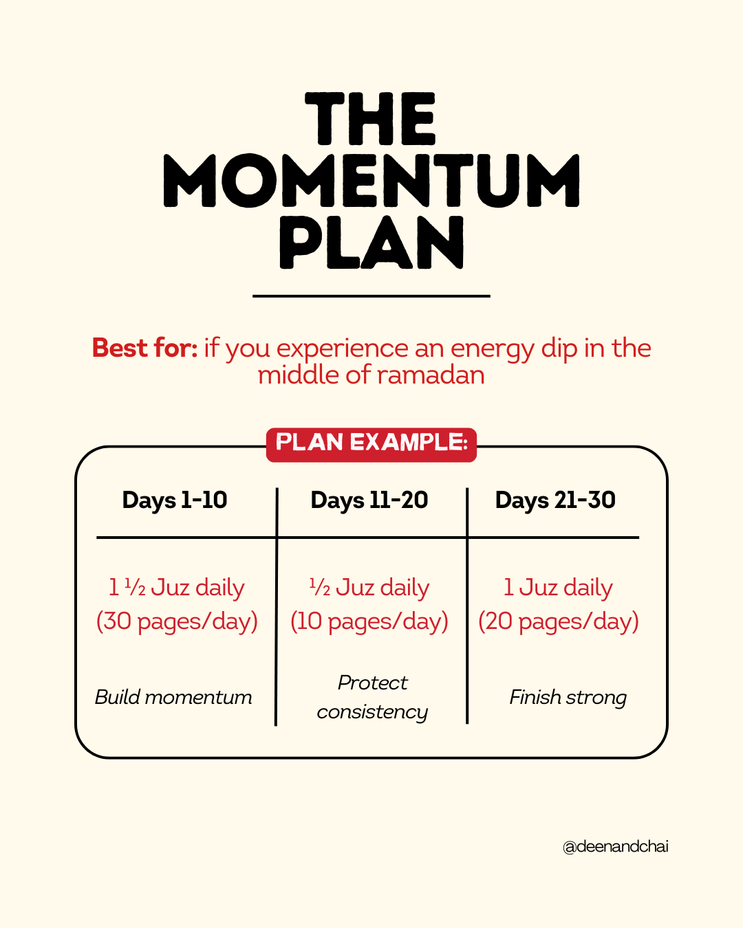 This method allows you to ease into the month strong, conserve energy when needed, and build momentum again in the final ten nights.
